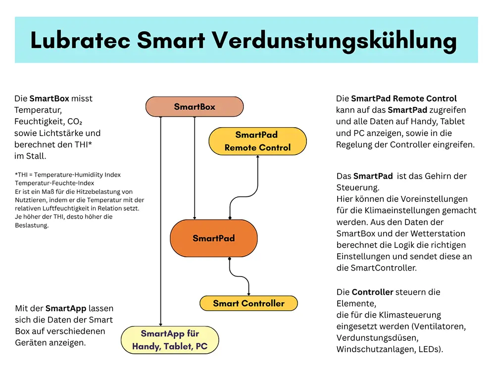 Durch die Kombination von Wasservernebelung und leistungsstarken Ventilatoren lässt sich die Stalltemperatur an heißen Tagen deutlich senken. Die feinen Wassertröpfchen werden gleichmäßig im gesamten Stall verteilt und sorgen für eine effektive Kühlung – ganz ohne nasse Oberflächen oder Kondenswasser. Gleichzeitig bleibt die Luftfeuchtigkeit im optimalen Bereich, was das Stallklima verbessert und das Wohlbefinden der Tiere steigert. Diese Technik ist besonders für Milchvieh-, Schweine- und Geflügelbetriebe eine wirtschaftliche Lösung zur Hitzestress-Reduktion und Leistungssteigerung im Sommer.